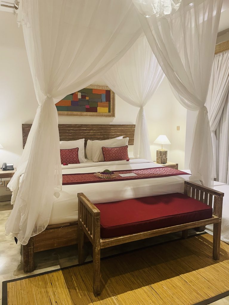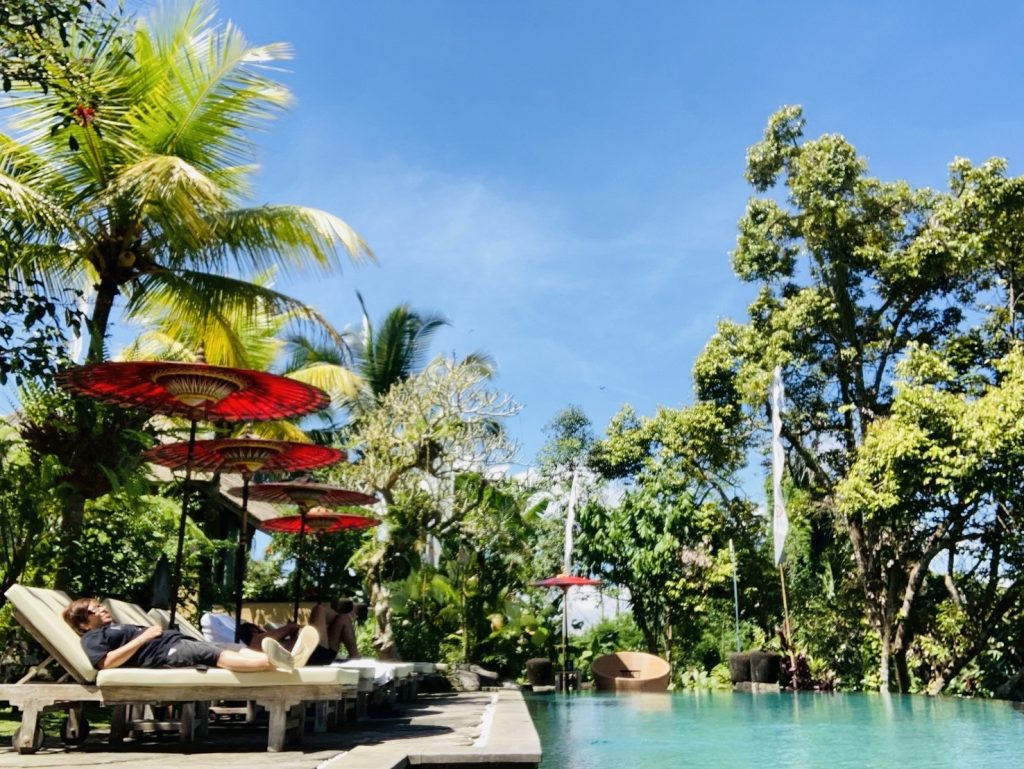 ウブドから遠く、grab【向こうのタクシー🚕安くて安全でアプリですぐ呼べて便利】でスミニャックから行ったのですが、遠くてガタガタの山道をどこまでも進んでいくと、ジャングルの中にポツンとある、それほど大きくないホテルが見えてきます